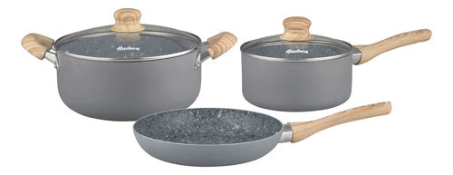 La batería Hudson GRA01 es ideal para quienes buscan un set esencial, moderno y funcional para la cocina de todos los días. Con aluminio liviano y antiadherente efecto granito, ofrece una excelente distribución del calor y cocción saludable sin que los alimentos se peguen. Su color gris piedra agrega un look elegante a cualquier cocina.