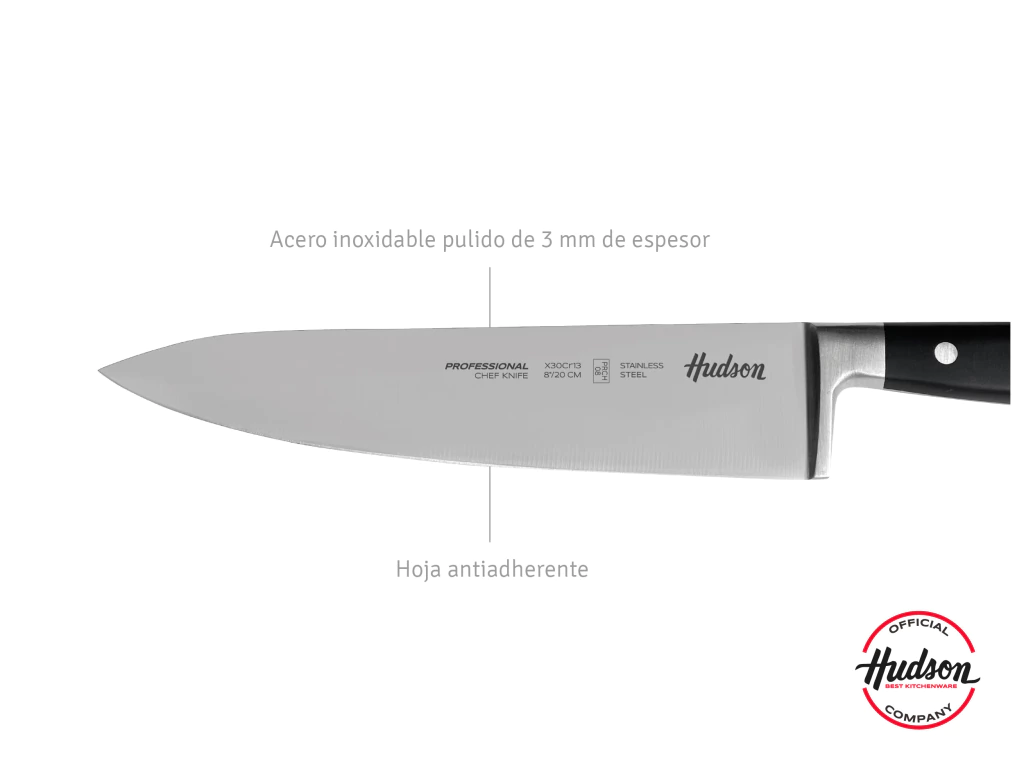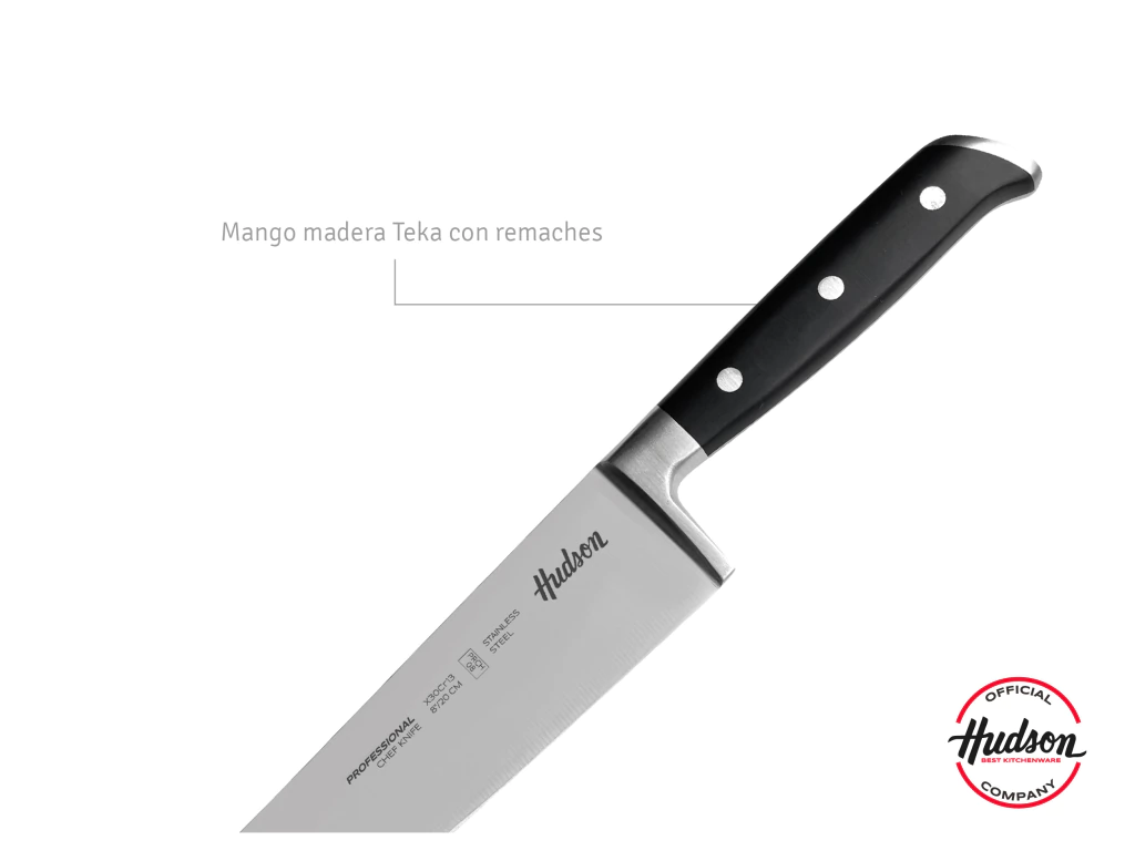 La Línea Professional de Hudson está pensada para quienes buscan excelencia y rendimiento en cada corte. Este cuchillo chef es una inversión segura y una adición valiosa a cualquier set de utensilios de cocina.