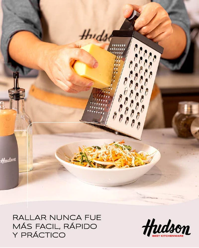 Simplificá la preparación de tus comidas con el Rallador Hudson de 4 Caras en Acero Inoxidable, un clásico indispensable en cualquier cocina. Su diseño multifunción te permite rallar, laminar o cortar distintos alimentos con facilidad, desde quesos y vegetales hasta frutas, chocolate o pan duro.