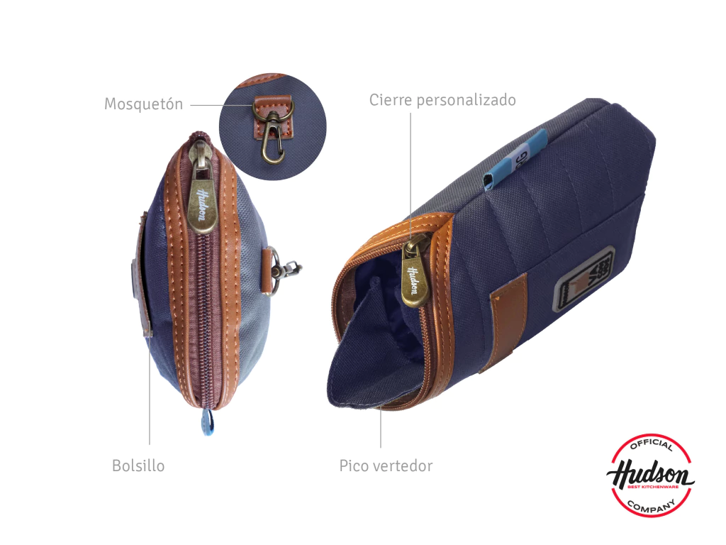 Elegancia, practicidad y durabilidad en un solo accesorio. La Yerbera Azul de Poliéster 100% Hudson Argentina está diseñada para quienes disfrutan del mate con estilo y comodidad. Su acabado en cuero sintético le da un toque sofisticado, mientras que el pico vertedor asegura que sirvas la yerba sin desperdicio. Además, cuenta con un bolsillo lateral práctico y un aplique de goma grifa textil que garantiza un cierre firme y seguro.